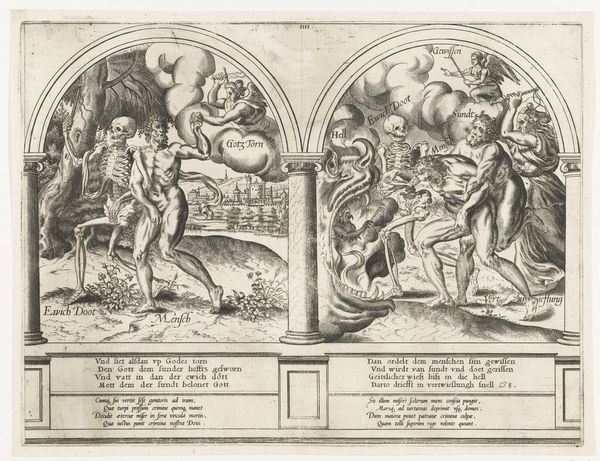 Editor: Here we have "The Victory of Christ over Death and Man Shown the Way by Faith," an engraving by Frans Huys, dating from around 1546 to 1562. The contrast is remarkable; it feels very symbolic. What do you see in this piece? Curator: Immediately, the division of space compels attention: a diptych format, visually articulating a dichotomy. Note how line dominates, delineating forms and defining textures. Consider the contrast in how the figures engage with their respective spaces. The ladder bisecting the composition serves as both barrier and bridge. Do you perceive its implied movement and what that entails for understanding the central tension in the piece? Editor: I see the ladder creating a transition, but I am wondering what relationship exists between the figures to the left and those to the right. Curator: Observe the classical architectural elements: columns framing each scene lend structural order. But, also consider the varying planes in which each scene is set, one with detailed renderings of men in garments, the other highlighting stark naked bodies. This work appears to strive for synthesis: through structural contrast and symbolic gestures the narrative emphasizes movement. How might those two arches affect how one experiences this transition? Editor: It’s becoming clearer now. The artist seems to juxtapose order with the chaotic, possibly presenting salvation as the intersection. Thanks for guiding me through this! Curator: The nuances emerge with layered interpretations. Art perpetually offers fresh vantages.