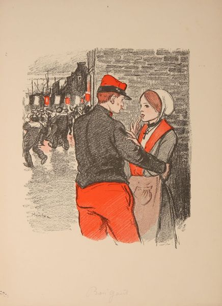 Théophile Alexandre Steinlen created this image titled "Innocence" with what looks like pen and watercolor. The composition features a gentleman, a lady, two horses and a dog which creates an engaging and somewhat charming scene. The gentle strokes of color create a serene atmosphere, drawing us into its narrative. The aesthetic structure is quite intriguing. The figures are placed asymmetrically which creates a dynamic tension. Steinlen’s delicate brushwork and restrained use of color is designed to communicate a certain mood, but also hints at deeper structural and philosophical layers. The very title "Innocence" invites reflection on the nature of purity. In closing, note how Steinlen uses scale. The large figures of the man and horses versus the smaller dog and woman is not just a representational choice, but a formal device to challenge our perceptions. Steinlen invites us to engage in a continuous dialogue with the artwork.