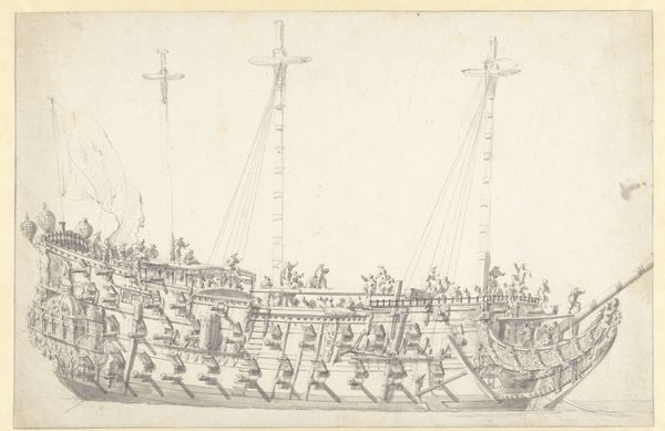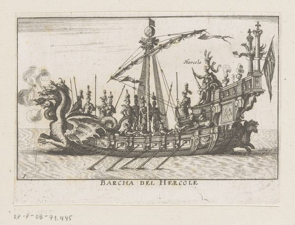 Editor: This engraving, "Ship with Orpheus and Bacchus," from around 1635, presents such a fantastically detailed vessel. All these figures seem almost suspended in this incredibly ornamented space. How do you interpret its historical significance? Curator: This print is fascinating because it visualizes the convergence of seemingly disparate figures from classical mythology within a contemporary socio-political context. It's not just a picture, but a claim. What does the pairing of Orpheus, representing order and music, with Bacchus, embodying ecstasy and liberation, suggest to you in this single space? Editor: Well, maybe it’s about bringing opposing forces into balance or… highlighting their inherent tension? It feels like a very staged encounter. Curator: Exactly! And that staging is key. The Baroque period, from which this comes, was obsessed with display. Think about the lavish court spectacles of the time. How do you think an image like this participated in that culture of display and power? Editor: I see, so the engraving itself becomes part of that spectacle. The ship, laden with figures and symbols, isn't just a ship; it's a political statement, perhaps about the harmony and power of the ruling class or an individual patron. Curator: Precisely! Engravings like these circulated widely, shaping perceptions and reinforcing specific ideologies. Consider the institutional forces—patronage, printmaking workshops, the art market itself—that made an image like this possible and what this implied in society. How does knowing that change your reading? Editor: It makes it much more deliberate, a carefully constructed image intended to broadcast a specific message and shore up cultural power. Thanks, seeing it within that broader context clarifies so much. Curator: Indeed. Art exists within and shapes the world. Considering those forces allows us to interpret artworks like this engraving far more profoundly.