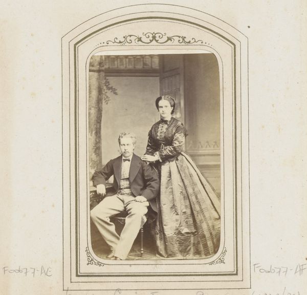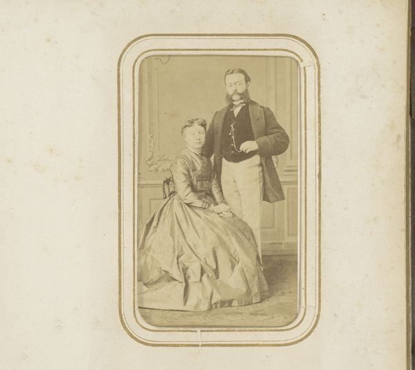 Editor: This is a fascinating photographic print from 1867 by Alfred Moitrier, titled "Portret van keizer Napoleon, keizerin Eugenie en hun zoon, als souvenir van de Wereldtentoonstelling van 1867," which translates to "Portrait of Emperor Napoleon, Empress Eugenie, and their son, as a souvenir of the 1867 World's Fair". It's really striking to see them posed so formally, almost like an official painting, even though it's a photograph. What's your take on it? Curator: The photograph really captures the self-conscious performance of Imperial power in the late 19th century. These “souvenir” photographs weren't just personal keepsakes; they were carefully orchestrated exercises in image control and distribution. Editor: So, it’s like propaganda through a new medium? Curator: Exactly. Think about the context. The World's Fair itself was a grand spectacle designed to showcase France's industrial might and cultural superiority. By distributing these portraits, Napoleon III was essentially using photography to disseminate an idealized image of his dynasty. How do you think this contrasts with how leaders project themselves today? Editor: I guess today it would be social media, like carefully filtered Instagram posts. But the idea is the same – curating an image. It's interesting that they chose this softer aesthetic, it looks like a painting at first glance. Curator: Indeed. That softness was likely intentional. While photography offered a semblance of reality, its inherent capacity for manipulation – through posing, lighting, retouching – allowed for the construction of a carefully calibrated visual message. Consider the setting and costumes – do they reinforce or challenge your understanding of 19th century power? Editor: It's really making me rethink photography's supposed objectivity! Curator: Precisely! By examining these images through the lens of history, we start to understand how art, in all its forms, plays an active role in shaping our perceptions of the world.