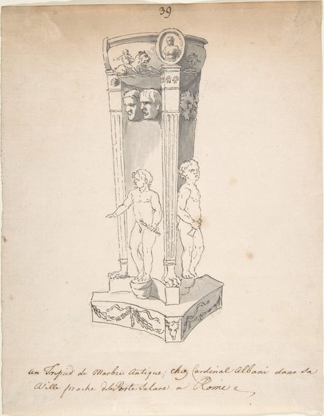 This print made in 1795 by Noach van der (II) Meer depicts a decoration on the Amstelveld. The artwork presents a scene of civic celebration, primarily using cool tones and precise lines to construct a formal, almost architectural depiction. The use of watercolour, combined with the print medium, gives the image a delicate, ethereal quality. Centrally, a classical column dominates, spiralled with greenery, acting as a plinth for symbols of national identity. This column is not merely a decorative element; its elevation signifies the stability and establishment of the new popular government. Enclosing this monument is a symmetrical arrangement of arches that creates a measured rhythm and dictates how one perceives the central column and the tableau it encloses. The work uses a semiotic system, positioning classical imagery within a contemporary political context to communicate ideas about governance and civic values. The artist destabilizes traditional monarchical symbols, replacing them with emblems of popular sovereignty. The print serves not just as a record, but as an active participant in shaping public perception and legitimizing a new socio-political order.