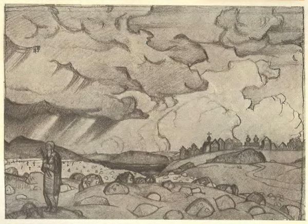 Editor: This is "Eastern Altar" by Konstantin Bogaevsky, created in 1919. It appears to be a print. It evokes a sense of both mystery and desolation. What symbols stand out to you in this landscape? Curator: Well, the most potent symbol is, undoubtedly, the altar itself, a severe architectural form atop a stark, rocky hill. It speaks to the endurance of ritual and belief in a world that may be crumbling around it. Note the lone obelisk to the right – a clear phallic symbol implying resilience, even eternal life. What emotions does this landscape evoke? Editor: The jagged edges and the dark palette make me feel uneasy, like something momentous is about to happen or perhaps already has. I also find the water reflecting everything rather compelling. It does add some complexity to the emotional landscape, doesn't it? Curator: Absolutely. Water here is not simply a reflection, it’s a conduit to the subconscious. Bogaevsky uses water, the universal symbol for collective subconsciousness to symbolize how cultural memory shapes our world-view.. Look closer. Are there shadows of similar altars deep within the water, hinting that our own conscious state rests upon ancient foundations of culture and faith? Editor: That is a wonderful connection to collective memory! Now I see how each component, like the monument, trees, and the jagged hills all appear to hint at past times. Curator: Bogaevsky paints an austere emotional portrait. The altar stands tall representing historical continuity with earlier periods. What do you now consider to be the artwork's emotional core? Editor: I initially saw desolation. However, I now appreciate the enduring character of this historical painting. It speaks to something timeless, even defiant in the face of change. Curator: Yes! I learned from our discussion the impact of symbols reflecting hope in places of devastation, inviting interpretations.