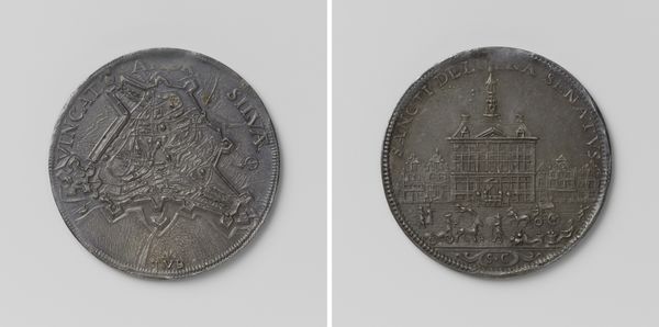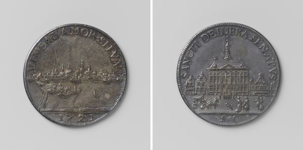 This is Theodorus Casparus van Berckel's 'Vroedschapspenning van de stad 's-Hertogenbosch', a silver coin with a diameter of 2.7cm. The coin’s structure presents two distinct sides, each densely packed with symbolic imagery. The circular form is not merely a neutral boundary; it actively frames and focuses our attention on the emblems of civic identity. One side features a crowned coat of arms, flanked by nude figures, all encircled by a Latin motto. The other side depicts a building, possibly the town hall, with an inscription arched above it. The building's orderly facade, divided into neat windows, contrasts with the organic, flowing lines of the figures and foliage on the other side. The semiotic system at play is evident in the calculated arrangement of symbols, each laden with cultural and political significance. The coin, as a medium, invites us to consider how power and identity are compressed and circulated within a material object. It is a discourse about value, authority, and the very fabric of society, captured in miniature.