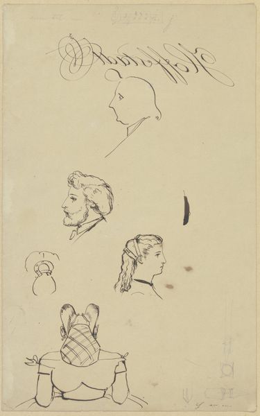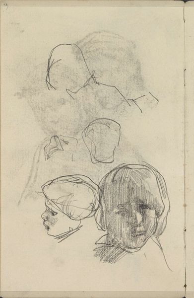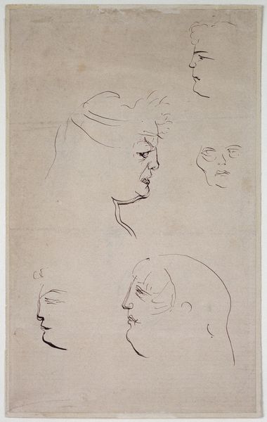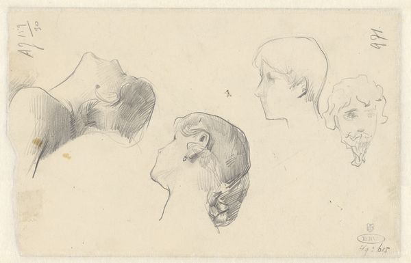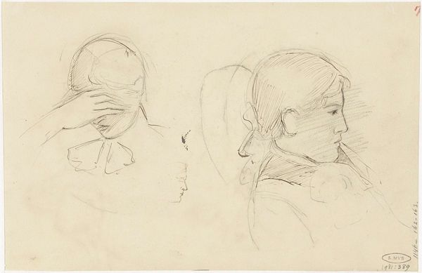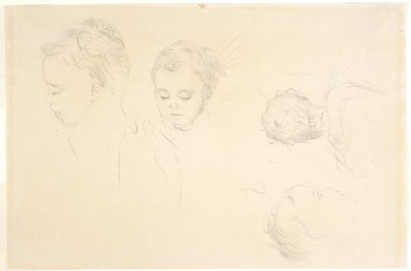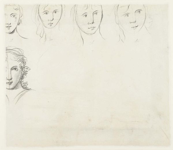 Curator: This delicate pencil drawing is attributed to John Flaxman. Titled "Head of Mary Magdalen and Two Saints(?)," it presents us with a study of three figures. There's a ghostly quality to the forms aren't there? Editor: Indeed, there's a striking sense of ethereal quietude. The light pencil strokes against the paper gives the impression of figures caught between presence and absence, especially those lines dissecting their faces. Curator: The presence of those lines makes me want to explore the materiality of its making: the surface of this particular sheet of paper, perhaps from his personal sketchbook; the varying hardnesses of pencils available, what brand? I imagine Flaxman choosing it carefully, even aware of the legacy he hopes to create. Editor: It’s compelling how these preliminary sketches—those lines bisecting the figures, almost like a veil—reveal something about the historical weight Mary Magdalen carries as a symbol, both sacred and, at times, shrouded in misinterpretations. She, even the others as assumed Saints, have endured varied symbolic re-imaginings. Curator: I like how you point out her multifaceted representation. What kind of paper stock did Flaxman use? The support seems relatively smooth, and that impacts how the pencil glides. Were his choices based on accessibility or informed intention to represent her character? And who might the other figures represent, and how does that context change if one were to learn more about Flaxman’s studio practices, models and daily routines? Editor: We can't definitively claim who the other figures are without more context, and whether they're male or female figures adds different readings given Magdalene's associations with varied followers or peers. The subtle shifts in each portrait speak volumes about archetypes we've constructed around sainthood, and they almost mirror Magdalene’s historical re-envisioning. The varying perspectives carry psychological implications too, as if reflecting different facets of perception of religious icons. Curator: So insightful, reflecting on its spiritual nuances. When considering pencil strokes and layering on a granular level, the repetition involved in the physical act reveals this study as its own process. Editor: Absolutely, from these ethereal wisps on paper, you can sense those deep symbolic wells. Curator: It offers a space where materiality intersects beautifully with our own interpretations and beliefs. Editor: I agree—Flaxman prompts a connection between historical identity and modern re-imagining, prompting consideration about the evolving narratives we weave around such significant religious symbols.