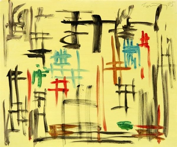Kazuo Nakamura made "Inner View #3" with paint, laying down these intersecting lines on a warm, golden background. Look closely, and you'll see how the black lines aren't perfect, straight edges. They waver and wobble, each one carrying the trace of a hand moving in space. It's like he’s mapped out a city of the mind, or maybe the blueprint for a feeling. There’s something about the color too, that ochre glow. It's not flat or uniform, but full of subtle shifts, like the light at dusk. The way he builds up the surface, you can almost feel the push and pull of the brush. He reminds me a little of Mondrian, but looser, more personal. But really, it's Nakamura’s own thing. "Inner View #3" reminds us that art is always a conversation, and that ambiguity is where the real juice is.