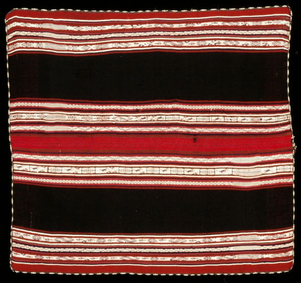 This ceremonial poncho was made by Aymara peoples. Look closely at the way that horizontal bands dominate the textile’s form, creating a field of visual rhythms. The broad, dark brown stripes alternate with narrower bands of red, pink, and white. Minute geometric designs, like tiny teeth, animate many of the stripes. This interplay of colors and textures evokes a sense of measured dynamism, as if the poncho were quietly humming with energy. The fringe, a decorative addition, softens the rigid geometry of the design. The poncho's structure is a form of visual language. Each element, from the stripes to the fringe, is a signifier within a semiotic system. When worn, the poncho becomes a mobile text, communicating cultural identity and status. The Aymara’s sophisticated weaving traditions use color, pattern, and structure to create a powerful form of non-verbal communication, rich with layered cultural meanings.