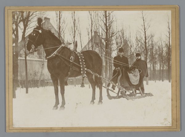 Editor: This photograph, "Untitled," was taken by William B. Post around 1903, and it's a gelatin-silver print. What strikes me immediately is the way the stark black and white emphasizes the deep snow and the strong, forward movement of the oxen. What do you see in this piece, especially concerning the pictorial elements? Curator: Formally, I am compelled by the arrangement of tonal values, moving from the brightest whites in the foreground snow to the muted grays of the distant trees and the stark contrast on the cattle. Notice how the artist guides our gaze—from the lead oxen, through the burdened cart, toward the solitary figure. What do you make of the depth of field, how some details are sharpened, while others remain soft? Editor: It does seem very intentional. I’m interested in the sharp focus on the leading animals versus the softer focus of the background figures. It brings an intimacy to the experience, almost as though we are alongside them in the snow. Curator: Precisely. Pictorialism often employs techniques to mimic painting, aiming for an artistic effect rather than pure representation. Consider the textures rendered through the gelatin-silver process— the rough coats of the animals juxtaposed with the smooth snow. How does this play into the work’s overall composition and affect your understanding? Editor: The contrasting textures make the oxen more lifelike; it is a lovely counterpoint. Is the tonal gradation, from dark to light, part of what gives it a realistic effect? Curator: Indeed, by mastering light, shadow, and texture, the photographer constructs not merely an image, but a deliberate artistic statement. Through structural means, one experiences the inherent artistic content. Editor: This exploration of formal structure and photographic processes provides a new way for me to consider art. Thank you for clarifying. Curator: And I, in turn, appreciate your keen insights, bringing the image into sharp focus through analysis of its structural elements.