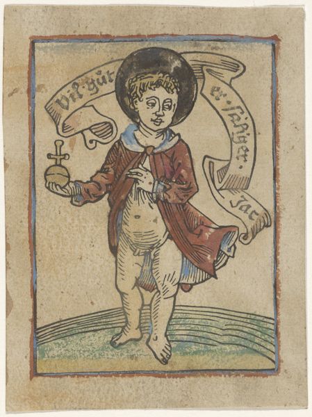 Editor: This woodcut, "Dracole Wajda," dating back to around 1500, presents a figure that feels both whimsical and unsettling. There's a distinct theatricality to his pose, framed by those almost cartoonish floral elements. What do you see in this piece? Curator: What strikes me is how this seemingly simple figuration participates in complex historical narratives. "Dracole Wajda," a representation of Vlad the Impaler, is being circulated as a broadside during a period of immense political anxiety concerning the expansionist threat of the Ottoman Empire. Do you notice the ornamental frame almost… cages him? Editor: Now that you mention it, yes, it does! I hadn't considered the broader context, only the aesthetic choices. Curator: This visual containment speaks to a contemporary anxiety. Representations such as these – produced for mass consumption via the printing press - often reduced complex figures to monstrous caricatures in the name of political messaging. Is this not how so many public figures are now caricatured on social media? Editor: So, the colourful aesthetic almost masks the more troubling underlying message? Curator: Exactly. The apparent naivety of the woodcut, its "genre-painting" feel, disguises the demonization of a cultural and political other. The "Dracole Wajda" print becomes less about accurately depicting an individual and more about constructing a narrative of fear, designed to unite the “Christian” West against a common enemy. Consider too that 'genre-painting' by definition shows scenes of everyday life and the association of Vlad with this gives an insight into how his character may have been viewed. Editor: That’s a powerful interpretation, reframing the entire image for me. It highlights the crucial link between art and propaganda. I’ll definitely look at art historical context with a new perspective. Curator: Indeed, examining the socio-political landscape reveals the layers of meaning embedded within seemingly simple artworks.