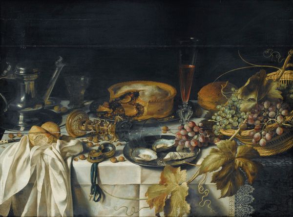 Pieter Gallis painted this still life, measuring 36 by 31 centimeters, using oil on canvas. At first glance, the painting offers a somber and subdued visual experience, dominated by dark tones that cloak the objects within an almost impenetrable gloom. Despite the darkness, the composition reveals itself through carefully placed highlights. A blue and white bowl, filled with what appear to be nuts, offers a stark contrast to the brown hues. Gallis uses light not just to illuminate but to create depth and texture, drawing our eyes across the crab, the bowl, and the glassware in the background. The objects are not merely represented but are presented as studies in form and materiality. The structure of the painting emphasizes a semiotic system where light, shadow, and color interact to destabilize fixed meanings. Each element—crab, nuts, and glassware—functions as a sign, inviting viewers to engage in an act of interpretation. The painting transforms the still life into an exercise in perception, challenging our understanding of representation.