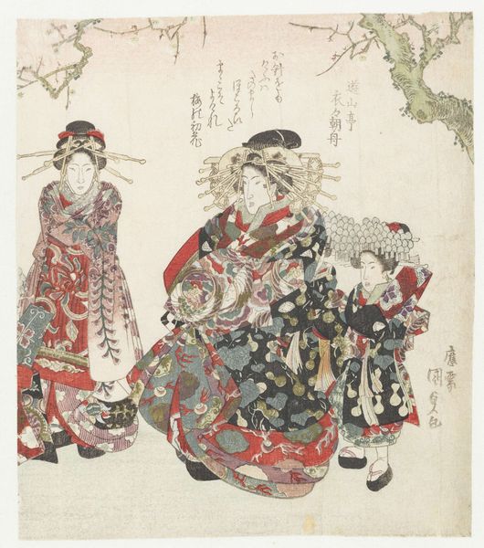 This print, "Yellow," or "Ki," by Ryūryūkyo Shinsai, was made in Japan in the early 19th century, and is part of a series titled "Five Colors". It's a woodblock print, meaning that the image was carved into a block of wood, inked, and then transferred to paper. Look closely, and you can see the characteristic lines and textures created by this process. The choice of colors—subtle greens, reds, and yellows—reflect the natural dyes available at the time, and also the aesthetic sensibilities of the Edo period. Woodblock printing demanded skilled labor, from the artist who designed the image, to the carvers who translated it into wood, to the printers who carefully applied the ink and paper. This collaborative process, typical of many forms of craft production, underscores the social dimensions of artmaking. The print was made for popular consumption, and so in a sense collapses the distinction between high art and everyday life.