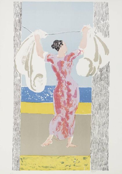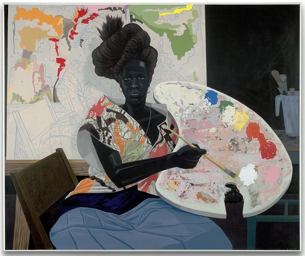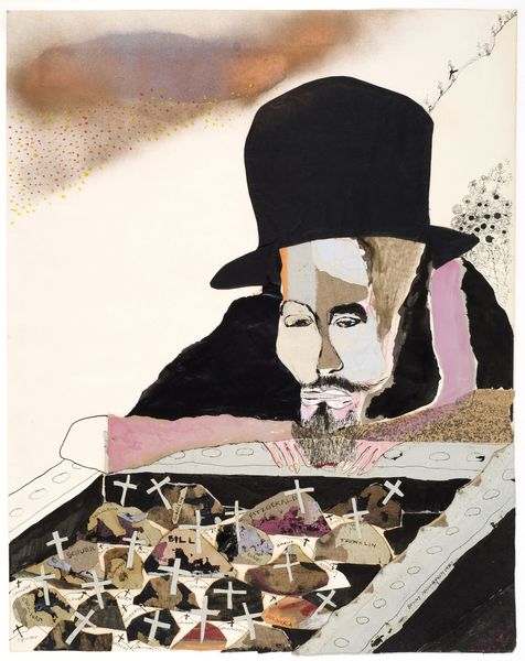 Benny Andrews created this mixed media work titled “Church Going Icon,” presenting a figure adorned with symbols of tradition. The wide-brimmed hat, a motif stretching back through centuries of religious and secular art, immediately captures the eye. A symbol of status and decorum in many cultures, the hat evokes the ceremonial regalia of religious figures. It mirrors the halos we see in Byzantine icons or Renaissance portraits. In ancient times, the pearl necklace was a symbol of purity and wisdom. This resonates with the spiritual yearning conveyed by the composition of this character, whose gaze, like that of religious icons, transcends time and mortal concerns. Note the flower-like design on the bag, which recalls the ubiquitous rose window in Gothic cathedrals. Though abstracted and simplified, it retains its essence as a potent symbol of spiritual awakening. These motifs invite the viewer to connect with the image on a primal, subconscious level, stirring a deep emotional response. Such symbols have continuously resurfaced, proving their enduring impact on our collective cultural memory.