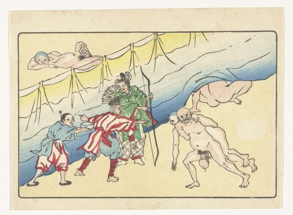 Curator: Kawanabe Kyōsai’s "Orgie", created sometime between 1870 and 1880, is an ink and watercolor drawing currently held at the Rijksmuseum. Quite the vibrant scene, wouldn’t you say? Editor: It certainly catches the eye. The figures appear weightless, almost cartoonish in their poses, like a snapshot from some wildly imagined floating world. What struck you about it initially? Curator: Its departure from the formal traditions of the ukiyo-e aesthetic is what grabbed my attention, honestly. While it nods to the floating world through its themes, its treatment of them is quite subversive. These aren't idealized figures; instead, they have a caricature quality. It almost reads like a political commentary when considering how strictly controlled those artistic representations were under the Tokugawa shogunate, particularly when dealing with erotica. Editor: Interesting! Looking at the material, I can see it wasn't intended as a fine art piece; it has the characteristics of a sketch in a personal sketchbook. What do you think about the lack of the traditional woodblock prints here, in favour of using ink directly onto paper? Its lack of rigid form suggests Kawanabe's artistic labour became free from the strict ukiyo-e form and able to engage in material experimentation. Curator: Yes! It showcases an intimate dialogue between the artist and the medium. It’s unrestrained. This period was also a key time for Japanese artists. During the Meiji era, there was growing interest in Western art forms, which definitely disrupted the conventional art system. This sketch appears to participate in this shift! Editor: Perhaps it can be argued it embodies the period. These dynamic and almost rebellious strokes challenge established hierarchies of taste, giving a voice to raw expression and highlighting art's subversive capabilities. Curator: Indeed. This sketch provides a peek into a pivotal transitional era for Japanese art. Editor: Well, seeing it through both our lenses offers a richer understanding, I think. A playful moment captured through unconventional material applications.