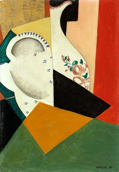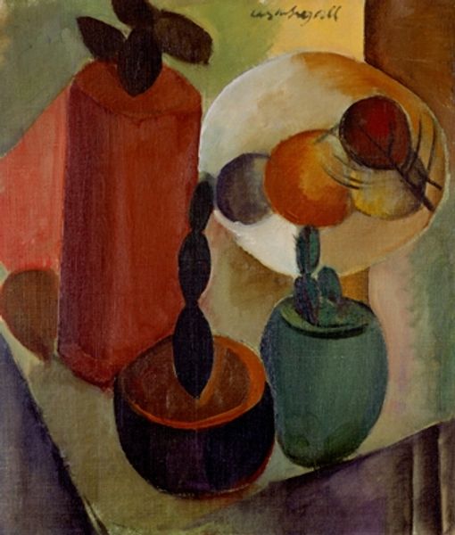 Curator: Looking at this piece, I find myself intrigued. "Still Life," attributed to Vicente Manansala, seems to bend the traditions of still life painting, playing with perspective and form. What strikes you initially about it? Editor: Well, first, it feels… surprisingly unsettling for a still life! I mean, that stylized fish lurking amongst the leaves has a certain menace, doesn’t it? The palette is earthy, almost muddy, which just adds to the feeling. Not your grandmother’s fruit bowl, that’s for sure! Curator: Exactly! The artist doesn't depict these objects in isolation. Instead, they become part of a larger narrative—a comment perhaps on Filipino identity, the relationship between urban and rural life, or even a subtle critique of post-colonial society in the Philippines. Editor: Ah, there's the Activist voice I know! But seriously, I can see that. There’s a raw energy, almost a clash of cultures happening right here. The bananas suggest a tropical setting, but that fish – is it threatening or threatened? And all that implied violence hidden under ordinary daily objects. Curator: The Cubist influence here helps amplify those tensions by breaking down traditional viewpoints. Think of how Manansala infuses local motifs into international modernism, a tactic very common at the time to represent anticolonial voices in visual form. Editor: I never expected such depth from something I initially found so… prickly! It definitely shows me that a simple vase of flowers can express some powerful things! Makes you see the everyday in a new light. Curator: I think the point of such pieces is that there's meaning if you dare to dig for it. The piece resonates powerfully if we realize it's about much more than just "things", and we've only touched the surface. Editor: Agreed! Thanks for opening my eyes to the stories that these "ordinary" objects have to tell, and that art doesn't always need to be pretty to have power!