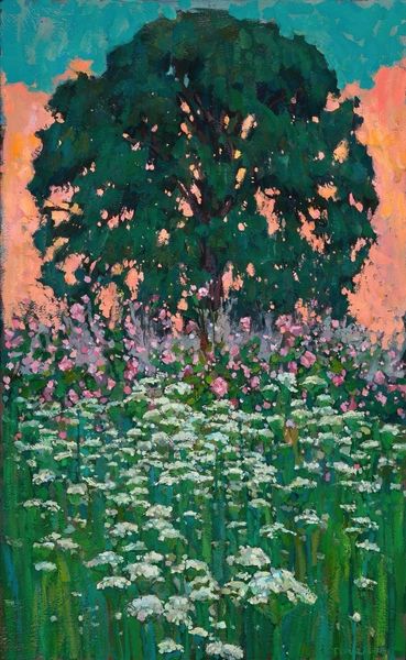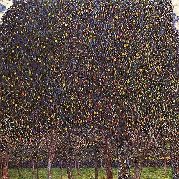 Editor: This is Gustav Klimt's "Pear Tree," housed at the Harvard Art Museums. I’m immediately drawn to its all-over pattern – it feels almost like a tapestry. What kind of visual symbols do you notice? Curator: Consider the pear itself. Across cultures, it symbolizes abundance, longevity, and even the feminine form. Klimt's rendering blurs the individual fruit into an overall field, perhaps suggesting a collective or universal experience of nature's bounty. What emotional response does that evoke in you? Editor: I suppose it feels comforting, like being enveloped in something nourishing. Curator: Precisely. The repetition reinforces a sense of cyclical regeneration. Note how Klimt uses these visual cues to tap into deeply rooted associations, connecting us to primal experiences. Editor: So, it's not just a pretty picture but a symbol-laden meditation on life? That's a perspective shift!