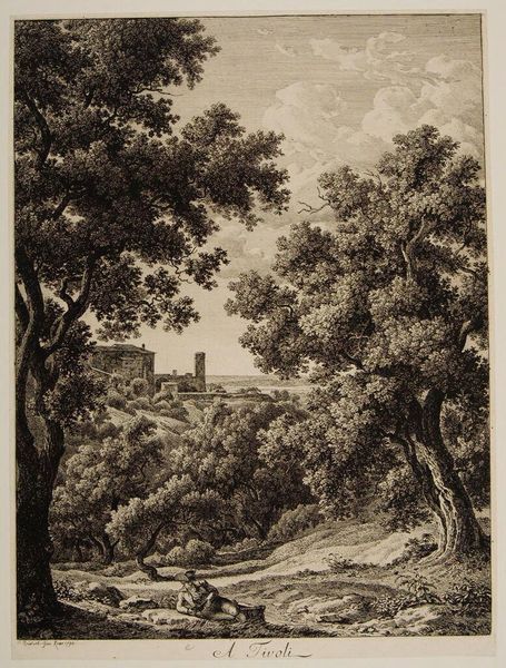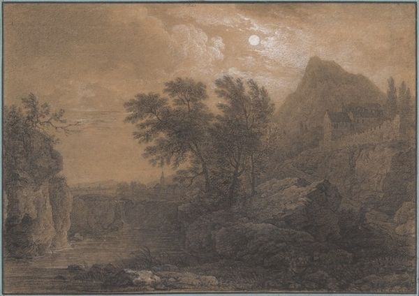 Curator: Here we have "Italianate Landscape with a Distant Town and a Mountain," by George Lambert, rendered in oil on canvas. Its age is uncertain, but it clearly evokes the spirit of an idealized Italian countryside. Editor: My first thought is of the color palette, those muted greens and browns punctuated by glimpses of creamy light. It feels… nostalgic, doesn’t it? A half-remembered dream of a place. Curator: Precisely. Observe how Lambert organizes space—foreground, middle ground, background. The trees in the front establish a certain framing; our vision is carefully directed toward the town perched on the hill. This reflects the conventions of classical landscape painting. Editor: That town feels almost like a stage set, doesn’t it? Those towers, walls… they speak of security, of boundaries, but the softness of the light makes them less imposing, more welcoming. And what of the mountain? What's its role here, looming large behind? It’s almost anthropomorphic in its shape, a watchful giant. Curator: You highlight an important point. Mountains have long carried symbolic weight, representing the sublime, the untamed aspects of nature. In a painting that strives for harmony, its scale creates a deliberate tension, juxtaposing civilization with wildness. Editor: And the figures in the foreground, are they merely pastoral staffage, or do they carry a message? I feel drawn to the symbolism in landscape genre like this, particularly the figures’ positioning – on a transitional pathway into this staged setting. Curator: Those figures do anchor the composition, certainly. In terms of function, they add human scale, but allegorically they remind us that we exist at the threshold of different worlds; civilization and nature in constant engagement. Editor: Lambert definitely captures that in the atmospheric perspective, blurring the sharp definition of nature. It pulls back the clarity so to create a world both realistic and dreamy at the same time. What a captivating visual study. Curator: Indeed. This work exemplifies how carefully structured composition can be the vehicle for very subtle evocations.