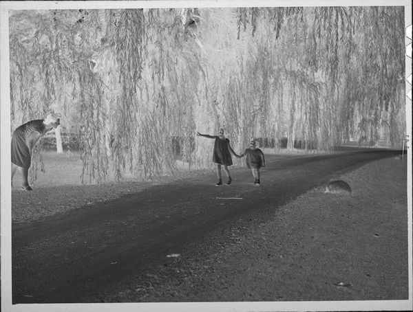 Editor: This photograph by Lucian and Mary Brown, "Untitled (boy watching dogs play outside)," is a small, intimate scene. The reversed tones give it a dreamlike quality. What's your perspective on this image? Curator: The photograph offers a glimpse into idealized domesticity. The image evokes a sense of nostalgia, reminiscent of simpler times and highlights the role of photography in shaping our collective memory. How do you think the artists wanted to portray this scene to the public? Editor: Maybe they were aiming for a universal image of childhood joy, something everyone could relate to regardless of the era. I hadn't really thought about it that way. Curator: Indeed, it presents a carefully constructed narrative, prompting us to consider the power dynamics within family portraiture and its representation in art history.