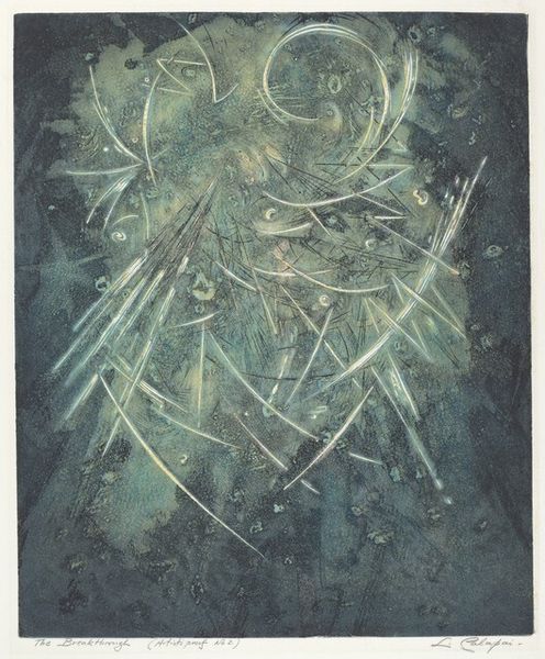 Curator: Colin Self’s drawing, “Shepherd with Lantern,” captivates with its stark contrast. What’s your initial take? Editor: It feels like a vision emerging from the subconscious. The light is both inviting and unsettling, the figure barely there. Like a half-formed memory. Curator: The lantern, traditionally a symbol of guidance and hope, is fascinating here. It casts light, but what does it reveal, really? Editor: Well, the shepherd is a classic archetype, the protector, the guide. But look at the way Self renders him—almost spectral, as if the act of leading is a burden, a lonely vigil. Curator: Indeed. The shepherd archetype carries an almost unbearable weight of responsibility. And Self captures that tension beautifully. Editor: A solitary figure against the dark. It makes me think about how light and dark define each other, and how sometimes, we only see what the light allows. It is a powerful statement. Curator: It definitely pulls you into the night. I'm glad we had this moment to reflect on Self’s vision. Editor: Me too. There's something hauntingly beautiful about wandering in the dark, and this drawing reminds us of that strange comfort.