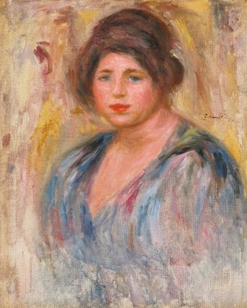 Curator: Let's delve into Pierre-Auguste Renoir’s "Jeune femme à la rose," painted circa 1918-1919. The medium is oil on canvas, and it's a beautiful example of his late-period portraiture. Editor: Oh, wow. She feels… nostalgic. Soft edges, that gentle gaze. It's like a memory, fading at the edges. Makes you wonder what she’s thinking about. A first love, maybe? Or just the price of bread? You never know. Curator: It’s tempting to frame her within the narratives of post-war Europe. Considering Renoir's own health struggles at the time, one could interpret the softness as a kind of yearning, a retreat into idealized beauty amidst turmoil. But it’s worth thinking about the gendered expectations too, how women were often represented in art of that era. Editor: True. Still, there’s a universal quiet in her eyes. He's caught that fragile beauty, before it dissolves. The brushwork is so free, almost careless, yet the emotion is right there. And the rose, naturally – cliché maybe, but perfect for framing her. It gives us, the viewer, something to hold on to. Curator: Indeed. The rose and indeed the composition invite us to consider themes of youth and the female form in a time of significant socio-political shifts. I would ask, who was she and did she conform to traditional beauty standards of the time or perhaps rebel? What could this art mean for her within art history? Editor: Ah, right on! Those little feminist jabs—they’re crucial for understanding this! Maybe the rebellion is there within those small decisions he’s making… Renoir's trying to show us something other than "male gaze 101". You can almost imagine the banter he’s trying to show us of the real her. That woman could be feisty, but in that time we have been conditioned to expect quiet womanhood in artwork! Curator: Exactly! Her agency and complexity! This piece offers fertile ground for discussions around representation, identity, and the gaze, inviting new readings within our current moment. Editor: Totally. It’s lovely to discover these new depths. Like pulling back gossamer curtains to get hit with the morning sun. Always more in there than meets the eye.