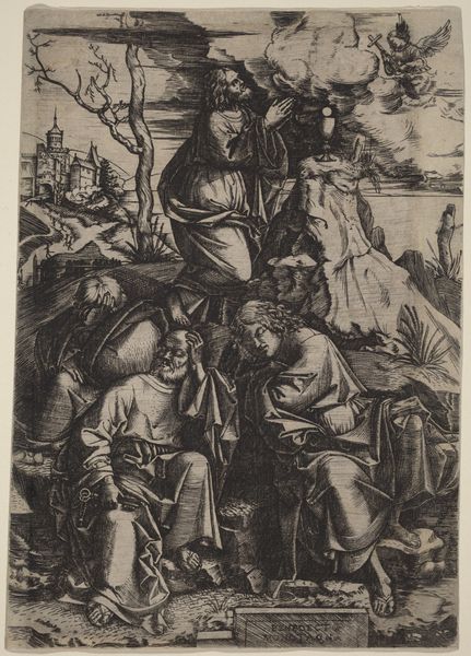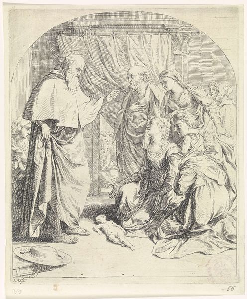 Curator: Looking at this Italian Renaissance print from somewhere between 1507 and 1599, attributed to Alessandro Gandini, titled "Maria met kind omringd door heiligen," my immediate impression is of a powerful convergence, a bringing-together of distinct energies. Editor: Indeed, there is a sense of condensation here, visually compacted by the high contrast and limited tonal range typical of pen-and-ink sketches. Note how Gandini constructs form primarily through outlines and hatching, which gives it this rather dramatic feel. The dense linework in areas like the foliage further intensifies this sense of visual concentration. Curator: Yes, that’s accurate. Beyond its compositional rigor, the artwork's narrative is deeply embedded in religious symbolism. Mary, with the child Jesus, is clearly central, evoking millennia of artistic tradition representing divine motherhood and innocence. But it’s the gathering of saints, their expressions, that really intrigues me. What do you make of them? Editor: From a formal perspective, it’s all about how the artist groups and poses the figures to direct the eye. Look at the rhythmic repetition of heads clustered around Mary, all slightly tilted, creating a visual echo chamber, almost. The strong verticals of the architectural elements and the figures help organize the space. Curator: I'd argue that the figures act as emotional conduits. Each one, from the kneeling boy to the haloed figures peering from the background, reflects a different facet of devotion. I find the work’s potency arises not just from aesthetic choices but from its ability to condense centuries of faith into a single, digestible image. Editor: Well, I can agree there. Ultimately, though, for me it's a matter of evaluating how these visual choices generate an overall aesthetic experience that is unique to printmaking. Curator: It certainly provides rich insights.