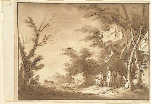 Curator: We're looking at "Landscape with an Old Bridge over a Stream," created between 1623 and 1635 by Pieter Dircksz Santvoort. The artist rendered it in ink and pencil. Editor: It's wonderfully moody. The monochromatic palette lends a melancholic air. The composition, dominated by that slightly precarious-looking bridge, directs your eye across the entire scene. Curator: What strikes me is how Santvoort uses readily available materials like ink and pencil to depict this Dutch landscape. Think about the socio-economic context: landscapes like this were becoming increasingly popular as subject matter, reflecting a growing national identity and pride in the land itself. The relatively simple media meant a wider range of people had access to making and consuming such imagery. Editor: Indeed, the medium lends itself to such detailed and textural rendering. The layering of strokes gives form to the cloudy sky, for instance. Structurally, the composition cleverly uses the diagonal of the bridge to offset the horizontality of the land. The strategic placement of the tiny figures introduces an interesting point of focus too, which provides us with a point of entry into the world presented. Curator: It is quite a remarkable landscape, especially if you consider how Santvoort used very few tools. A drawing like this offered a means of circulating images and ideas about the countryside, functioning almost as a proto-photograph for a society hungry for depictions of its surroundings. This one is also on paper. Can you imagine the types of paper mills and inks used at the time? And who were the paper makers? Editor: It offers such clear visual structures; you are drawn in almost instantly. The scale invites contemplation on the harmony of its composition and material form. Curator: Exactly. And thinking about its journey through time, from Santvoort’s hand in the 17th century to its display today in the Statens Museum for Kunst—the life of materials is fascinating. Editor: Ultimately, this is about that dialogue, or even dance, between line, form, and texture, is it not?