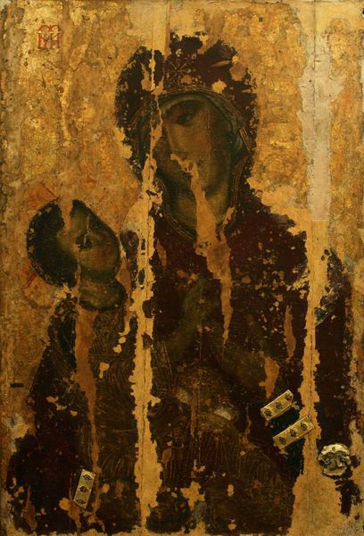 This Orthodox icon of St. Peter and St. Paul resides in the Cathedral of St. Sophia in Novgorod, Russia. The dominant visual experience is one of solemnity and age, where warm earth tones interplay with the figures' draped robes and the background's textured surface. The artist uses line and color to construct the figures. The lines delineate form, while the muted palette fosters unity, drawing the eye upward to the faces of the saints and the small figure of Christ above them. The composition, seemingly simple, reveals a structured arrangement, inviting contemplation. The icon's formal qualities—its scale, proportion, and the symbolic use of color—reflect a structured theological worldview. The artwork is not just an aesthetic object but a site where visual codes intersect with spiritual and philosophical ideas, encouraging an ongoing dialogue between the artwork, its cultural context, and the viewer.
