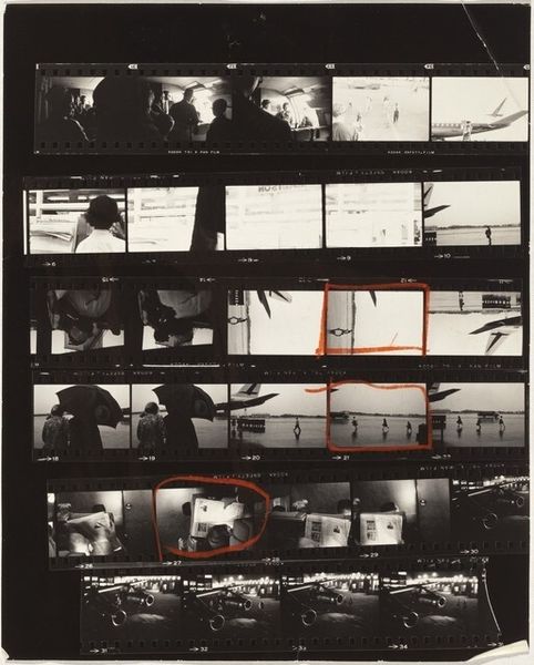 Editor: So this is Robert Frank's "Guggenheim 401--Las Vegas, Nevada," from 1955. It’s a photograph presented as a contact sheet with some red markings on it. It feels… disjointed, like snippets of a story rather than a clear narrative. What strikes you most about its formal qualities? Curator: I am drawn to the stark contrast and its inherent discontinuity, you’re right. Consider how Frank presents the photographic object itself – the strips of film, the sprocket holes, the apparent markings. These are not meant to be concealed; they’re part of the composition. The red markings introduce an active line, bisecting and framing, emphasizing a specific reading. How do these elements contribute to the work's meaning? Editor: I suppose they prevent a singular interpretation. The red lines guide the eye but also feel disruptive, highlighting certain frames while excluding others. Curator: Precisely. It’s about selection and framing, both literally and figuratively. The high contrast enhances the geometric shapes within each frame and between frames, creating an overall grid-like structure. The subjects within each exposure lose representational clarity; instead, line, shape, tone are thrust forward. Do you see any underlying thematic structure emerging from these purely visual arrangements? Editor: Well, the framing seems to connect some of the images of what looks like suburban homes and barren land… so maybe there’s a statement on urban development, maybe something bleak? Curator: Perhaps. Think of the visual relationship between those elements, rather than relying on iconography alone. Is this juxtaposition visually pleasing, unsettling, or deliberately ambiguous? Editor: I think, unsettling, for sure. The visual information presented feels broken, intentionally fractured. Curator: Exactly. The tension between the fragmented images and the structuring red lines creates an effect of deliberate visual discord. This discord is not merely a byproduct of the process but an active principle in Frank's construction of the photograph. Editor: I see it differently now. It's less about "what" is being shown, but "how" it’s being presented. Curator: Indeed, it encourages us to engage critically with the medium of photography and the act of seeing itself.