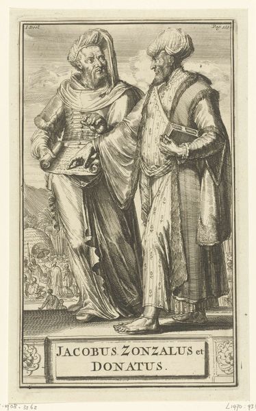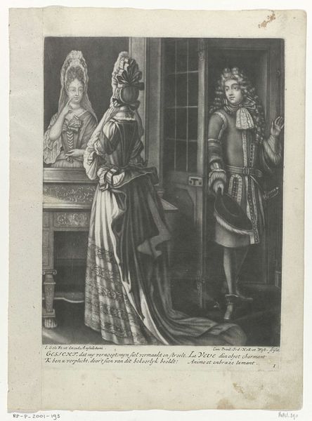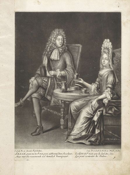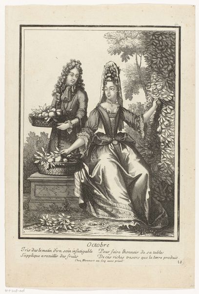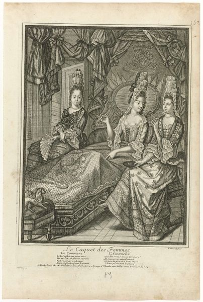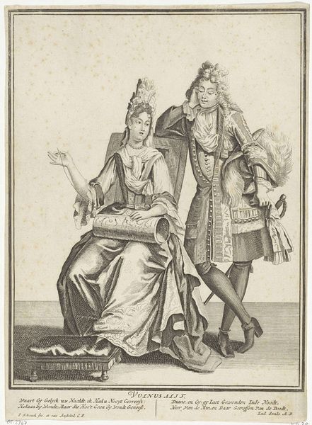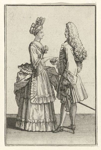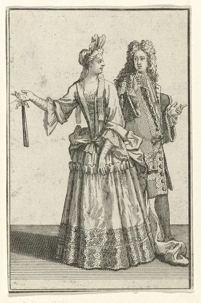 Curator: Looking at this print, "Standing and Seated Woman Dressed in a Manteau," made between 1683 and 1733 by Bernard Picart, currently held at the Rijksmuseum. It's a lovely peek into fashion and social life of the era, isn't it? Editor: It feels intimate. As though we're intruding on a private moment. The detail in the engraving is exquisite—all those ruffles, the lace...it’s a real textural feast. What's a "manteau" anyway? Curator: It was a loose, informal gown that became popular at the end of the 17th century. Less restrictive than previous formal wear, signalling changing times in aristocratic social circles. Notice the one woman stands, holding what appears to be a fan or perhaps rolled sheet music, while the other sits and reads from a large book of music, presumably. Editor: The standing figure's eyes really capture my attention. They suggest some narrative is taking place or just about to unfold, no? It's like I want to reach out and stop her. Is there about to be a grand reveal? A confession? Curator: Perhaps a little of both. These kind of prints depicting daily life – known as genre painting, sometimes bleed into other types, like portraiture or historical scenes. So while seeming simple, it might convey complex social cues about class, gender, leisure. Engravings made art and information far more accessible. Editor: Definitely accessible and so incredibly stylish! And look how controlled the lines are! I feel as though the print emanates such an elegance. The baroque really shines through with such confidence. It has the same essence of control. What an accomplishment that the clothes do not weigh the women down and allow them to become more intimate and personable to us in modern times! It's a gorgeous reminder of those simple daily scenes, of music, and the fine detail of existence, too often missed. Curator: Exactly! A fascinating sliver of the past that continues to speak across centuries. It definitely offers up some wonderful insights. Editor: Agreed. The emotional resonance is uncanny, I must agree. Thank you!