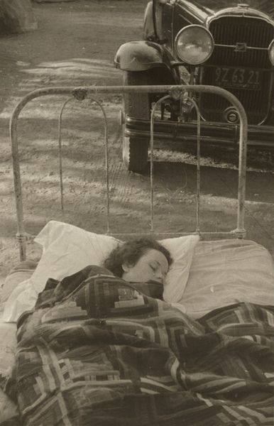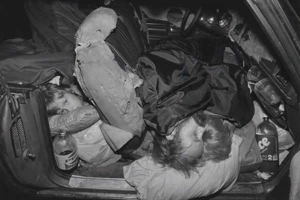 Curator: Tom Hunter’s "Sunday," a c-print created in 2000, offers a compelling glimpse into contemporary life. Editor: The scene initially strikes me as melancholic. The subdued lighting and the subject's posture suggest a moment of quiet introspection, perhaps tinged with weariness. Curator: Indeed. Note how Hunter uses the structure of the van to frame the composition. The geometric lines of the interior create a sense of enclosure, focusing attention on the figure at its center. Observe, too, the contrasting light: the cool illumination entering from the window versus the warmer tones within the vehicle. Editor: That contrast is interesting. The light filtering through the doorway seems to offer a sense of hope or escape, while the interior could symbolize the confines of daily routine. The prone figure becomes an archetypal image of rest or even resignation within a confined domestic space. There's also a possible association with the Christian concept of Sabbath. Curator: Perhaps. The choice of setting and subject speaks to a specific reality—the lives of those on the fringes of society. Through sharp lines and natural light, the photographer skillfully captures a moment of vulnerability, devoid of sentimentalism. The bedcover draws the eye as well, an explosion of floral design disrupting the bleak background of brown. Editor: Absolutely. The floral pattern introduces a feminine touch, perhaps indicative of domesticity. It seems almost to subvert the grit of the interior and suggest some kind of emotional world for this sleeper, as do the discarded effects nearby, like a discarded cosmetic bottle. These symbols combine into an unusual tableau. Curator: These minute details lend layers to the interpretation, reflecting on ideas of contemporary existence, stillness, and temporality. We begin to unravel a sophisticated arrangement that relies on an elegant rendering of shapes and colours, to draw us ever closer to the truth within. Editor: This piece serves as a potent reminder that beauty and significance can be found even in the most unassuming circumstances and compels viewers to see the familiar with new perspective. Curator: Indeed. Its enduring resonance lies in its capacity to provoke contemplation about modern living and the inherent complexities woven into seemingly straightforward everyday settings.