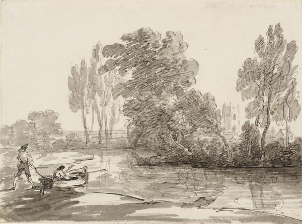 Editor: Alphonse Legros’s “Bend in the River,” done in etching, feels both serene and melancholic to me. I am struck by the textures he was able to create, despite having minimal resources to work with. What can you tell me about how the method of production is connected to what we see in the image? Curator: It's perceptive to consider the material constraints and labor that shaped this etching. Notice how Legros uses hatching and cross-hatching? This wasn't just aesthetic, but necessary. Etching demands a controlled, repetitive labor, doesn’t it? Each line etched into the plate reflects a conscious, physical act. He would need to press down repeatedly. How might such labor connect with his representation of rural life? Editor: I never considered that. So the act of repeatedly pressing down becomes like the farmer with his harvest, bound to labor and the Earth? Curator: Precisely! We might also consider how prints were consumed and by whom. They are reproducible objects. How does that impact its social value in relation to paintings which are obviously one of a kind? Did this make his work available to those who may not have had the social capital to obtain a painting? Editor: So etching flattens hierarchy. Suddenly it makes sense why so many artists utilized print-making techniques as ways to expose injustice. The masses can see themselves depicted and feel united. It all goes back to the artist choosing the proper methods to communicate with their audience! Curator: Exactly. By focusing on the materials, tools, and labor that created this seemingly simple landscape, we gain a deeper understanding of the artist’s world and, in turn, our own. Editor: I learned so much about how artists carefully construct the tools with which to reach people, both aesthetically and socially. I have a lot more to think about!