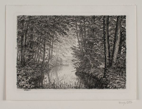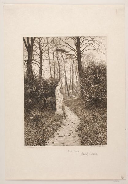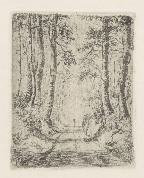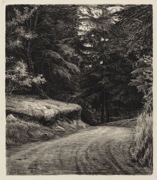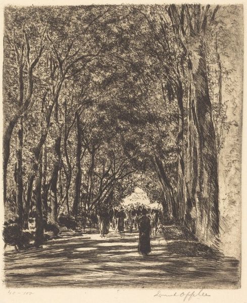Axel Holm created this print, "Sukkenes allé," using etching, a process with a long and rich history. The method involves covering a metal plate with a waxy, acid-resistant ground. The artist then scratches into this ground with a needle, exposing the metal. When the plate is immersed in acid, the exposed lines are bitten, creating grooves. Ink is then applied, filling these grooves, and the surface is wiped clean. Finally, the plate is pressed onto paper, transferring the image. Look closely, and you'll notice the incredible detail Holm achieved. This wasn't just about technical skill; it was a labor-intensive act, demanding patience and precision. The stark contrasts and fine lines invite us to consider not only the scene, but also the social context of printmaking, and the value we place on both artistic vision, and hours of manual work. Hopefully, we can appreciate the rich dialogue between craft and art.