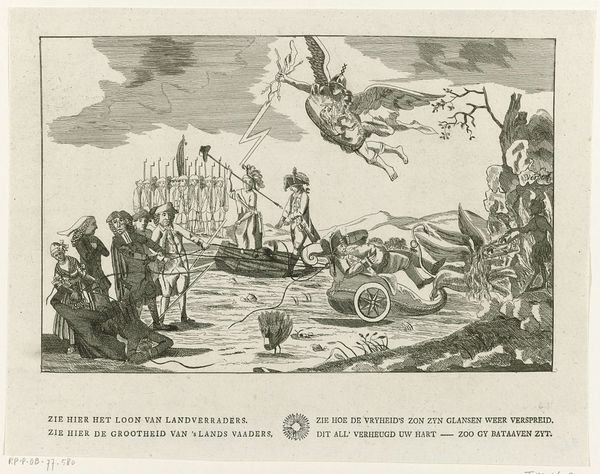 Curator: This is Salomon Savery’s "Oorlogsmonster," or "War Monster," an etching from 1657 held here at the Rijksmuseum. Editor: Oh my! What strikes me first is the sheer, monstrous absurdity of it all! This fantastical creature is built of weaponry; it’s a dragon fused with instruments of war. Darkly humorous. Curator: Savery was known for his detailed engravings, and here we see a masterful control of line and tone, achieved with ink on paper. Consider the context: the Dutch Golden Age, a time of immense trade and prosperity, but also of constant naval conflict and expansion. Editor: The layers of symbolic association are incredible. The dragon, a classic symbol of chaos and destruction, is here made even more grotesque. The incorporation of armor, cannons, even musical instruments twists them into something malevolent. Curator: Absolutely. The tools of war, which could also be regarded as objects of utility and craft, become instruments of oppression. Savery transformed the ordinary into something symbolic of destructive power. Editor: Note the cannon erupting in the distance. Savery shows us war engulfing everything, literally built into the anatomy of this beast. It also begs the question, who benefits from the perpetuation of such a monster? Curator: Savery himself came from a family of artists and engravers, so the very act of producing this image implicates the labor and artistry required to sustain the cycle. How do we confront such monstrosity when it's integral to society itself? Editor: Right. And to go further, even the smoke billowing around the dragon becomes a ghostly presence, the visual symbol of a haunted nation after battle. One leaves with the disquieting image of this bizarre hybrid that becomes war itself. Curator: Yes, this unsettling allegory of militarization resonates deeply with questions about labor, trade, and how we give shape to war in our collective psyche. Editor: Truly, seeing this image invites us to face these horrors anew. Curator: Exactly. Savery offers us more than just fantasy; a challenge.