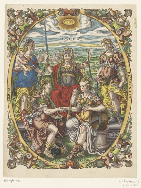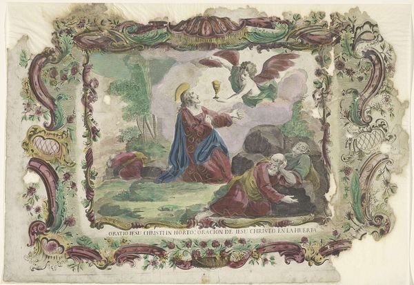 Editor: Here we have "The Flight into Egypt," an 18th-century print by Giovanni Volpato, currently housed in the Rijksmuseum. It's a delicate scene, quite ornate with all its baroque styling, but there's a strange sense of unease that it gives me, with the precariousness of the situation facing this small family unit amidst such chaos. What do you see in this piece? Curator: Unease...yes, I felt something akin to that on my first viewing. Think about what ‘flight’ means—uprooting. This baroque piece uses lush colours, doesn’t it? Look at the ornate frame of flora, so at odds with the stark reality of exile. And have you noticed the detail? The city they are headed to. It looks just like ancient Rome! I think it captures how the familiar comforts are both beautiful and yet can often be trapping as they head toward an unknown safety in the face of their old home persecuting them. What an engraving. How does that read to you? Editor: That's fascinating. I hadn’t thought of the city as potentially representative of Rome; a little odd considering the subjects' circumstances. Are you suggesting Volpato subtly comments on the sometimes stifling nature of established power structures even while rendering it beautiful? It does feel… almost deceptive. Curator: Deceptive. That's it. The deceptive veneer of established society against personal stories is something you notice across time. Art gives us language. What's even more fascinating, can you imagine that those colors that give so much to this feeling have been added later to the bare print?! How ephemeral, a second hand interpretation to a scene! I imagine each added choice is someone having to put their own spin on it, in the now. Isn’t that curious? Editor: That is wild. It truly does make it a dialogue through time. Curator: Yes, it does. And each viewer participates in that same dialogue!