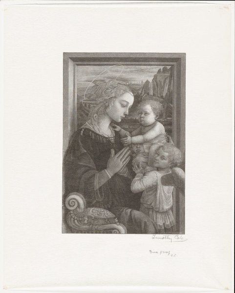Editor: Here we have Timothy Cole’s “Madonna and Child,” a wood engraving from 1902 currently held at the Minneapolis Institute of Art. The monochrome palette really emphasizes the delicate lines and almost ethereal quality of the figures. What do you make of it? Curator: Well, seeing this piece, especially the medium of wood engraving, takes me back to the late 19th and early 20th centuries. The print market was booming. Consider the cultural impact of reproductive engravings like this one, making artwork accessible to a broader public. Who was able to afford these prints versus the original paintings they replicated? Editor: That’s a great point; prints definitely democratized art consumption to some extent. Curator: Exactly. And beyond affordability, think about the distribution networks! Engravings could be circulated through magazines and books, shaping public taste and artistic knowledge on a mass scale. Do you think that a wood engraving provides a unique view, compared to a similar drawing or painting? Editor: Yes, the distinct lines and texture are intriguing. I also find it interesting to think about Cole as an engraver interpreting an original painting, potentially by a Renaissance master—acting as a filter between the artwork and the public. Curator: Precisely. It's not just about replicating; it's about translation. The engraver leaves their own mark. That is, their skill, interpretation and inevitably their cultural context, all influencing the reception of the original artwork. By looking closely we can understand what society viewed as 'ideal', versus any actual subject of the time. What do you make of this specific image choice - the Madonna and child, as an appropriate theme for the home at the time? Editor: It makes me appreciate how a work on paper like this reveals so much about art's role in society beyond the museum walls. Thanks! Curator: Indeed, reflecting on the mechanisms through which art is viewed and spread truly deepens our appreciation.