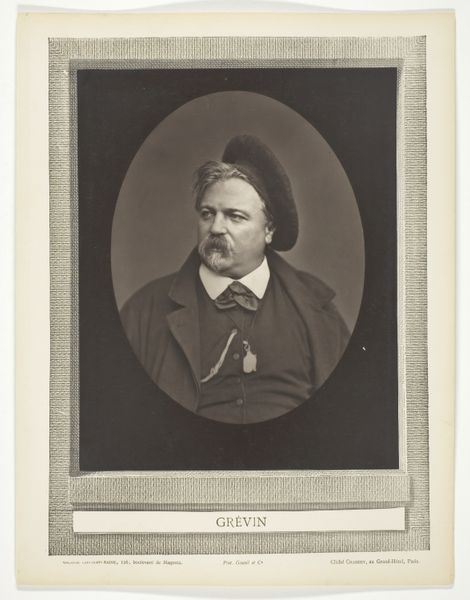 Curator: This is a photograph titled "Alfred Grèvin" by Chambey, currently residing at the Harvard Art Museums. Editor: It's strikingly serious, a very formal and imposing portrait. Curator: Indeed. Grèvin, a caricaturist and costume designer, is presented with careful attention to his clothing and beret. Note the visible photographic process around the oval of the image. Editor: I see a clear attempt to portray Grèvin as an intellectual figure, evidenced by the artistic cap and upward gaze. It suggests aspiration. Curator: Or perhaps it's a calculated construction, a form of advertising and identity creation for a successful artist in late 19th-century Paris. The materials suggest a certain status. Editor: I still read the image as striving for timelessness through symbol. The beret functions as a signifier of artistic genius. Curator: Perhaps a balance of both: material presentation and iconic signaling working hand in hand. Editor: Agreed. It seems we've uncovered a fascinating interplay of ambition and cultural symbolism in this portrait.