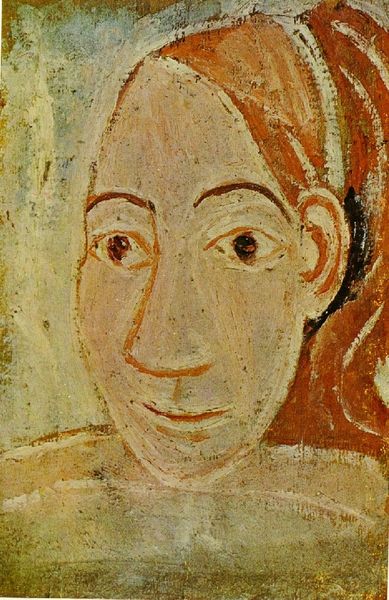 Editor: Okay, next up we have "Head of a Young Man" painted by Pablo Picasso in 1906. It’s an oil painting, and what strikes me is the earthy color palette; it gives the portrait an almost classical feel. What can you tell me about this painting in terms of its cultural moment? Curator: Certainly. What appears to be a ‘classical feel’ you rightly point out, is actually Picasso wrestling with the legacies of artists like Cezanne but also ancient Iberian sculpture, which he saw examples of at the Louvre. It reflects a moment of cultural rediscovery and a move away from the academic portraiture that had dominated salons for so long. Look at the subject’s gaze: passive, thoughtful even… Editor: Yes, and the brushstrokes seem intentional, adding to the reflective mood, although still a bit romantic? Curator: I think that is an interesting assessment. Think about this historical context for a moment: Who are the public for art at the time? And, also, think of where paintings like this may have been exhibited. This was a period of seismic shift and transformation. Picasso's style here hints at something about this figure's own place and role in it, moving away from old ideals to uncertainty about what it could become. Editor: So it's more than just a portrait of an individual but it’s really also a glimpse into the changing values and public expectations of art at that moment? That’s really fascinating to think about how societal shifts were being mirrored. Curator: Exactly. Considering it within the wider history of art and social change provides deeper understanding. Editor: Well, this has definitely broadened my appreciation! Thanks for this, I will think of this historical moment now.