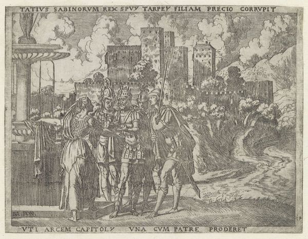 Giovanni Battista Fontana created this print, "Romulus Takes the City of Caenina," in the 16th century using etching and engraving. The intricate lines, achieved through painstaking work with sharp tools and acid, give the scene a sense of depth and drama. Look closely, and you can see the way Fontana used hatching to create shadow and volume, transforming a flat surface into a dynamic battlefield. This wasn't just about artistic skill; it was also about the development of printmaking as a medium. Etchings like this made it possible to reproduce images and ideas, contributing to the spread of knowledge and the growth of a visual culture. The image shows how much work and skilled labor went into production in this period. Fontana's print represents a victory, but also the labor and skill behind its making. It reminds us that art is often born out of craft and design, and that the techniques used in its creation can carry just as much meaning as the subject itself.