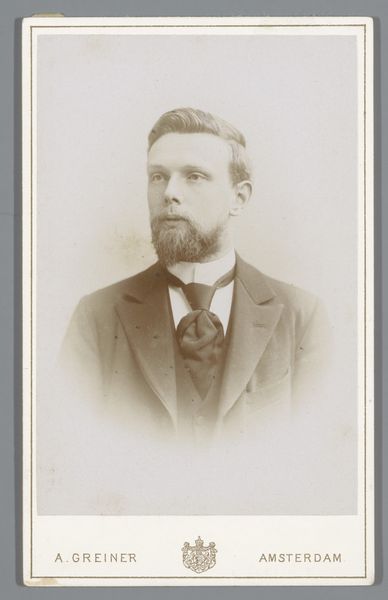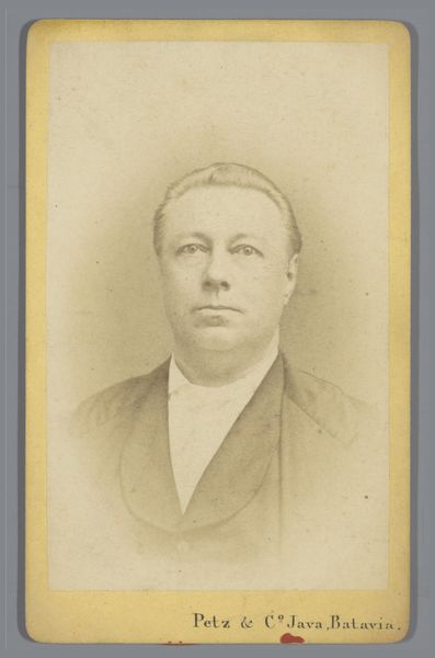 Curator: Here we have an albumen print, “Portret van een man” made around 1868. The sitter is presented in an oval vignette, framed by the rigid geometry of the card mount. Editor: It’s incredible how somber and still the image feels. I’m immediately struck by the quiet dignity—almost melancholy—in the man’s expression. There's a stillness about him that feels very weighty. Curator: These portraits were enormously popular. People craved images that preserved their likeness, and photographs offered unprecedented realism. They wanted to leave a legacy. His steady gaze is indicative of the values prized in the Victorian era. Editor: Absolutely. There is an interesting dynamic at play between personal identity and social representation. I see the bow tie as a symbol of the rigid gender roles and social codes of the time, especially in the business world. How limiting must that be to have the way you look determined by external constraints and power dynamics! Curator: In those times, the portrait wasn’t just a personal memento. The images held significant social capital. A visible symbol of belonging, status and an anchor for familial memory. A means to connect future generations to those in the past. It seems that the gentleman's stern gaze symbolizes a yearning for that type of recognition. Editor: What resonates for me is the silent dialogue it ignites around the construction of identity—a dialogue that transcends time and that persists even today. In what ways has his ability to express himself fully been shaped, reshaped and possibly contained by social expectations? It encourages one to examine and question established systems, both from the past and our own, isn’t it? Curator: Looking closer, I find a profound narrative embedded within the tangible quality of this print. It embodies both a universal desire for preservation and connection across generations and his individual social and historical circumstances. Editor: I’m touched by the quiet resistance and stoicism in the subject’s face, reminding us that beneath societal constraints, people preserve hope in defining their personal narratives.