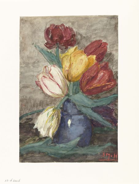Curator: Walt Kuhn painted this still life, "Zinnias," in 1933. I find its simplicity quite striking. Editor: It's more somber than I expected. The blooms are so vibrant, practically glowing against that oppressive dark backdrop. Almost like individual personalities pressed into service, would you say? Curator: In a way, yes. Consider that the 1930s were a period of immense social upheaval. While seemingly simple, the subject matter speaks to broader artistic concerns of the era: art’s accessibility and its perceived role as an escape from reality during times of turmoil. It’s also worth considering how floral paintings—which were often associated with femininity and domesticity—became arenas to challenge societal norms around taste. Editor: Exactly! Flowers themselves have carried varied symbolism across centuries. Here, these zinnias—bursting with layered petals—strike me as symbols of resilience. Zinnias are very common and available in varied colours. I am drawn to how the flower and the vessel create a composition of contrasting dark versus lighter colours. How did Kuhn balance the need to offer reassurance while acknowledging underlying unease through his artistic technique? Curator: Kuhn seems interested in flattening perspective, which was a Modernist trend that deliberately moved away from realism. But the thick, painterly application gives depth to each blossom, anchoring them and hinting at more personal emotions at play. It feels like a kind of private expression, almost guarded, at a time when outward expression could be difficult. He was part of the avant-garde; perhaps that’s why these blooms feel like clandestine revolutionaries, subtly resisting any prescribed narrative. Editor: The very deliberate arrangement, the careful study of colour, these zinnias embody complexity in the face of economic austerity and personal strife. Every single detail screams about the capacity of individuals to grow against hard situations. Even now, a century after it was painted, Kuhn’s "Zinnias" transcends mere representation—they act as visual symbols of fortitude. Curator: Indeed, that combination of aesthetic simplicity and underlying symbolism lends enduring appeal. It provides an insight into how paintings of beautiful yet commonplace subjects are anything but in times of conflict.