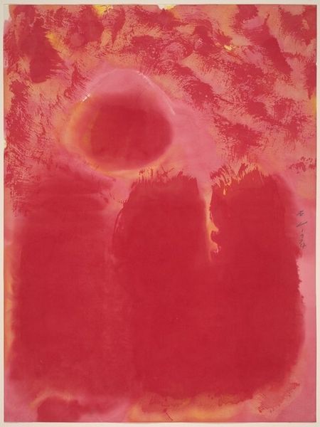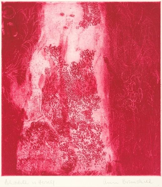 Curator: It’s a bit like looking at a dreamscape, wouldn’t you say? This is Marc Chagall’s "The Tale of the Ebony Horse," a lithograph made sometime between 1945 and 1946. Editor: It's an intense wash of sanguine hues. A bit unsettling, almost like a half-remembered nightmare fighting its way back to the surface. Curator: Absolutely, there's a rawness to it. It’s rendered as a narrative art, seemingly telling a tale. I see a kind of beautiful chaos, don't you? The ebony horse itself is lurking down on the bottom left, tethered loosely by line. Editor: I notice the recurring motif of levitation—figures hovering, seemingly unbound by gravity. What narrative purpose do you think that serves here, beyond just being, well, Chagall-esque? Curator: Ah, to float free! Chagall often used levitation to express spiritual freedom, escaping earthly constraints. In this context, maybe it is showing us figures and beasts released, maybe delivered from fate by this Ebony Horse. Does it look this way to you? Editor: I am less certain about reading transcendence, although the idea is charming. Note how the line work isn’t particularly graceful, as his drawings often were, nor is it particularly skilled. The cross-hatching is chaotic, as if rendered in great haste and speed. This speaks to a potential interpretation— that of unrest. Curator: Yes, exactly. I see Chagall working rapidly as if trying to transcribe what is being revealed to him. He wasn't always technically precise— it was all about feeling for him. This way of creating really unlocks the artwork. When it works. Editor: And when it works. I see what you mean. What strikes me most are the visible layers—the erasures, the corrections. These ghost-like figures add a layer of complexity to the overall structure. Curator: They certainly do. So what, then, do we conclude here? Do we like it, finally? Editor: I wouldn’t say I “like” it. But I concede that I've come to better see how he translated, as you said, feeling into form. I appreciate, let us say, what Chagall tried to do. Curator: It is a raw moment caught in a print. We're witnesses.