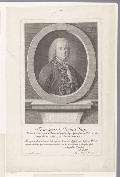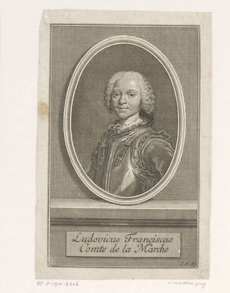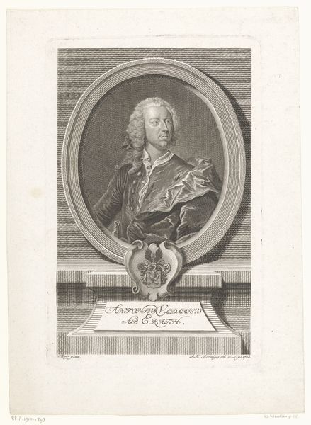 Editor: This is an engraving from 1752 by Jonas Haas, titled "Gerhard de Lichtenberg." The detail is incredible. The way they captured the textures of the wig and the fabric… it’s really quite impressive. What stands out to you about this portrait? Curator: What I see is a representation of power and status meticulously constructed through visual language. Think about the Baroque era: it was defined by absolute monarchies, social hierarchies, and the burgeoning influence of mercantile elites. This portrait performs specific cultural work. Editor: Cultural work? Could you expand on that? Curator: Yes, certainly. Consider Lichtenberg's pose, attire, and the architectural framework in which he's presented. These aren't accidental details. How do they reflect the socio-political dynamics of his time? Editor: He looks very self-assured. I see what you mean, it’s a very staged kind of power… The ornate window and the text also make it seem like he's meant to be memorialized. Curator: Precisely! These aren't just aesthetic choices, but deliberate assertions of social standing, embedded within a system where appearances reinforced authority. Even the act of creating and circulating this portrait signifies a level of privilege denied to most. Do you see a way in which it excludes the commoners of the time? Editor: Wow. I hadn't really considered that. So it’s not just a portrait; it's an artifact that embodies the power structures of its time. I'll definitely remember that when looking at art from this era. Curator: Exactly! Art doesn't exist in a vacuum, but reflects, reinforces, and sometimes even resists the dominant ideologies of its era. Seeing art as embedded with social, cultural, and power dynamics makes it very powerful.
