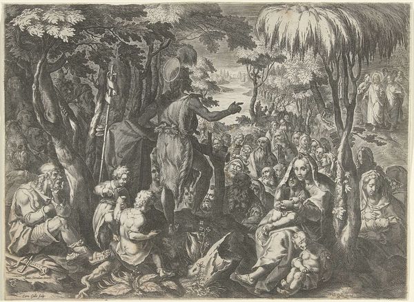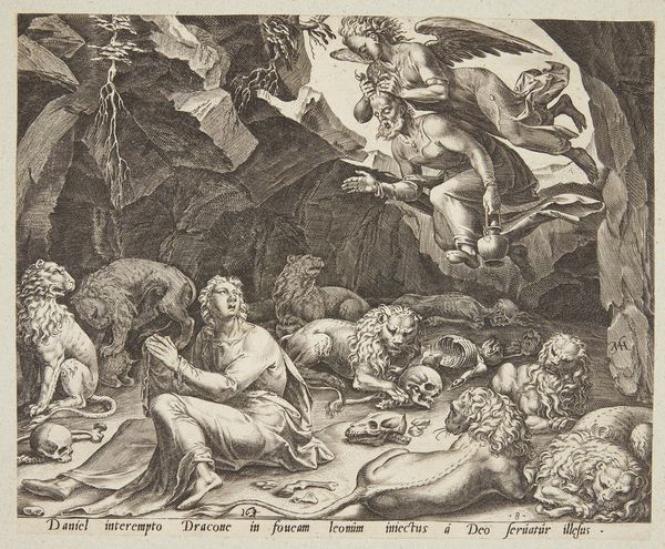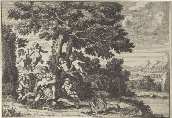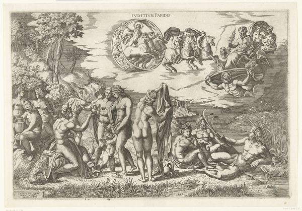 This etching, *Adam and Eve in Paradise*, was created by Romeyn de Hooghe in the late 17th century. The composition presents a striking contrast between the celestial and the earthly. The upper portion is dominated by clouds and divine figures while the lower part depicts Adam and Eve surrounded by a diverse array of animals and exotic figures. De Hooghe uses dense, intricate lines to create a sense of depth and texture, inviting the viewer into a complex world teeming with life. This print uses the narrative of Adam and Eve to engage with ideas about creation, nature, and humanity's place within the world. The organization of the elements is not just an aesthetic choice but also a reflection of the period's understanding of the universe. The Garden of Eden becomes a space to explore the relationship between humans and animals, reflecting a broader cultural interest in the natural world. The symmetry of the composition and the idealized forms of Adam and Eve suggest a harmonious vision, yet the detailed rendering of the natural world hints at a more complex, potentially destabilizing, understanding of paradise.