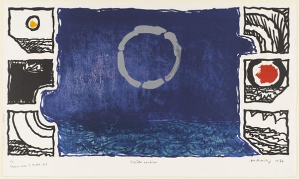 Curator: This is Barry Flanagan's "Atlantic Moon," part of the Tate collections. The cool blue immediately suggests a sense of tranquility and distance. Editor: The stark contrast between the blue and the white gives it a graphic quality, almost like a poster. I am curious, how was this effect achieved? Curator: It's a print, so most likely a lithograph or screenprint, allowing for those bold, flat areas of color. Think of the labor involved in preparing the screens and the inks used. Editor: Focusing on the image itself, the crescent moon, stars, and water reflections create a beautiful, simplified composition. It is so simple! Curator: Yet, that simplicity speaks volumes about the artist's hand and the industrial techniques. Editor: Absolutely. It’s interesting how Flanagan reduces the scene to its most essential elements, creating such a powerful image. Curator: A clear demonstration of the power of accessible printmaking techniques. Editor: Indeed. It's a captivating work.