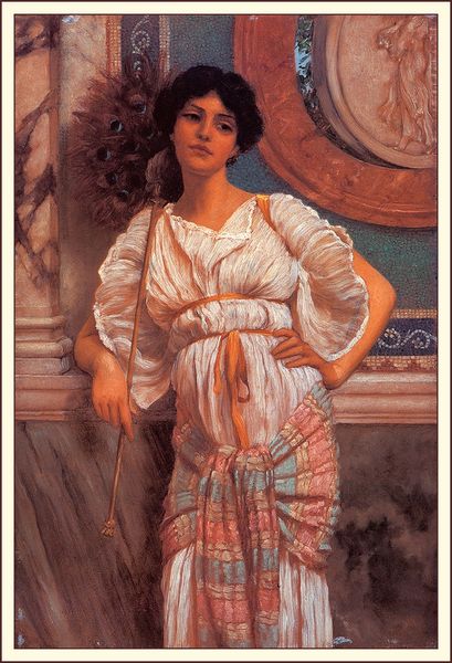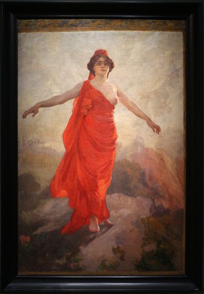 Curator: This is "The Odysseus," painted in 1858 by Jean-Léon Gérôme. Gérôme, of course, was a leading figure in the French Academic style. Editor: My first impression is one of surprising simplicity. The palette is quite muted, almost monochromatic, and the composition feels incredibly restrained. The billowing green fabric definitely draws the eye, its swirling form creating an immediate sense of movement and drama, yet is simultaneously confining her within its boundaries. Curator: Indeed. And I think we need to consider this painting within the context of 19th-century academic painting. The depiction of Odysseus, or perhaps, a more metaphorical interpretation of his journey home, becomes an exploration of colonialism and gender roles. She seems burdened, perhaps trapped by duty or expectation. Editor: It is her expression; that look of resignation, that really grabs me. Her eyes seem to convey this intense weariness. You have to look closely to really observe how Gérôme contrasted this soft expressiveness with such tightly controlled drapery, with such formal lines defining her robes, to fully communicate her exhaustion. Curator: Precisely. What seems like a simple portrait quickly unravels under closer scrutiny into a narrative of internal conflict and social constraint. Is she meant to embody triumph, or to be read as an allegory for feminine subservience? Look at her bare feet—that striking symbol of vulnerability. And what to make of the municipal coat-of-arms at the top left of the canvas? Editor: From a formal perspective, I find the flatness intriguing; and what some viewers may call “primitive”. Look at the shadows on the fabric, that push of the avant-garde toward flatness so masterfully done here. In his brushwork Gérôme seemed to presage changes happening throughout the artistic communities of France. The more you look, the more apparent it is, how avant-garde he was, in fact. Curator: A prescient approach—one that underscores our complex relationships with the visual representation of historical events. Editor: Gérôme makes me think again about what it really means to create art from history; which, here, is just another term to apply to identity. Curator: Absolutely, these representations influence not just our historical understanding but, indeed, they are very alive today.