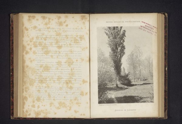 Editor: We’re looking at a photograph called "Landschap, vermoedelijk in Zwitserland," or "Landscape, Probably in Switzerland." It’s by D. Lenoir, made before 1898, and appears as part of a book. The image itself seems fairly unassuming; the focus feels like the somewhat gnarled, barren-looking trees in the foreground, leading towards… maybe mountains in the distance? What strikes you about this work? Curator: Oh, darling, doesn’t it just whisper of forgotten stories and whispered secrets? For me, it is more about what's *implied* by the starkness and the aging page—the landscape receding almost shyly. I see Switzerland, sure, but also a past where photography was as much about feeling as it was about documenting. And the journal page itself. Do you think it enhances or detracts from the image itself? Editor: That’s an interesting question! I’m torn. I think seeing the text alongside the photo definitely adds a historical context and gives it more character, but it also distracts a bit from the image itself, making it harder to focus on the landscape. Curator: Exactly! It is both a frame *and* a mirror, right? One wonders what these photographers knew then; one even questions the validity, because to my knowledge early photographers enhanced or outright changed details within their frame. Is it more "real" now than the same location in real life? Or has it always felt like we look "back" at ourselves *through* photographs...almost superimposed like. Hmmm. But if only the journals could be truly experienced, hmm. Editor: That's really fascinating, that photos might even be more 'real' than life. It certainly puts a new perspective on landscape photography for me. Thanks! Curator: It all circles round! One can even see new growth here - perhaps what old ghosts grow anew from! Now what to have for tea?