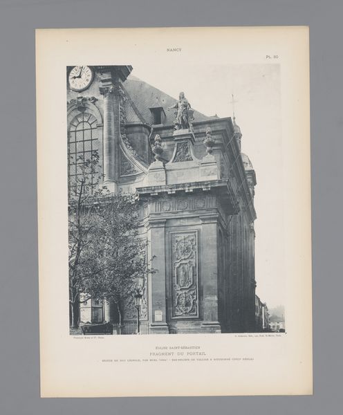 Curator: This photogravure, credited to Charles Bernhoeft, showcases the "Herdenkingsmonument van Johannes Gutenberg te Straatsburg," captured before 1894. A monument of Gutenberg in Strasbourg. Editor: The image has a certain quiet dignity. The greyscale tones emphasize the monument's presence in the cityscape. It feels… grounded, substantial. Curator: Bernhoeft's technical precision allows for a striking examination of textures. Notice how the light catches the stone. This reflects a burgeoning sense of civic pride in technological advancement at this time, using photography as a promotional tool. Editor: The positioning is very deliberate, isn't it? The buildings create a solid background for the sculpture. Do you think it aimed to communicate an understanding of social order? Curator: Undoubtedly. The deliberate arrangement highlights a vision of progress. Editor: How do you interpret the statue’s gaze? Is it directed outwards, towards the future? Curator: Precisely! In monuments, we often find those semiotic markers— the gaze representing future progress or acknowledging societal dependence. These choices are loaded! The photographer is making subtle indications about technological promise to his late-nineteenth-century audience. Editor: Bernhoeft captures not just a monument but also a moment. Curator: Indeed. Considering its status as a print, and knowing the location was a significant printing hub, what are the broader social forces do you feel might be in motion here? Editor: Well, Strasbourg and its place in the development of printing… It all seems part of that complex interplay of local and national identity as printing accelerates social changes at this point in history. The photograph participates in that process, right? Curator: Absolutely, our experience with these images has changed. A key feature is how images like this create a direct access to cultural symbols which serve social goals. Editor: It has certainly offered a new perspective on public sculpture in our own present. Curator: Agreed; thinking about the photograph as part of public space encourages a deeper sense of the statue and our relation to civic ideals.