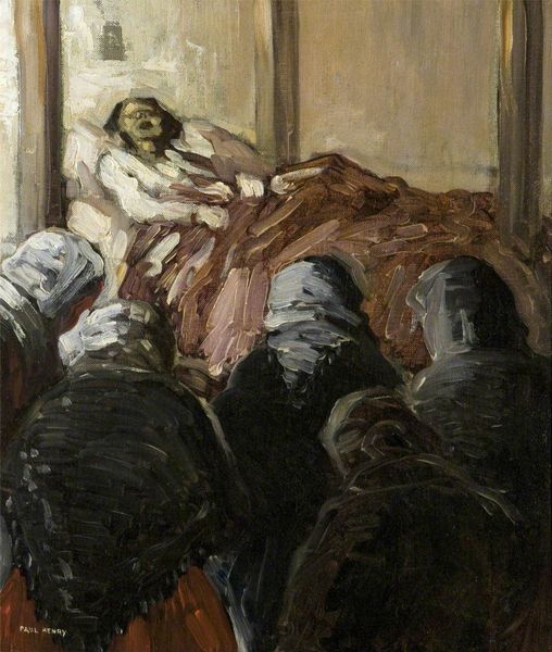 Curator: I find this work by Lucian Freud, dating to 1954, so compelling. The piece, an oil painting called "Hotel Bedroom," offers a snapshot of intimate life. The composition immediately strikes me as claustrophobic. The figures are so close to the picture plane, it almost feels voyeuristic. Editor: Indeed. The man standing at the window seems to emanate such tension. The muted palette certainly intensifies the feeling of unease. I wonder what narratives these characters and their settings evoke within the cultural landscape of the 1950s. Curator: Precisely. I see this visual vocabulary laden with psychological depth. The bed becomes symbolic, a stage for the theatre of the soul. Look at how the stark light emphasizes the vulnerability on the woman's face, perhaps revealing emotional burdens or internalized expectations from the time. Editor: Good point. And isn't it telling that Freud has chosen this moment, this candid stillness, to memorialize these individuals. Was he reflecting his immediate reality? Does their ennui comment on post-war culture at large, perhaps signaling anxieties of displacement, loss, or disillusionment within intimate spheres. Curator: I think so. It is intriguing to think how spaces, like this hotel room, operate as powerful containers of memories and personal experience. We become witnesses to what's not immediately visible on the surface, exploring emotional and social themes reflected in its subjects' expressions, gestures and posture. Freud exposes psychological states, inviting contemplation on mortality, introspection, and perhaps a quiet revolt. Editor: The painting invites an investigation into the history of private versus public experience, specifically what domestic environments represent during periods of social transition and trauma. Ultimately, this is much more than a domestic portrait; it is a rich tapestry woven with individual and historical symbolism.