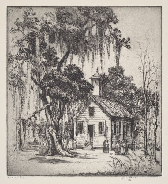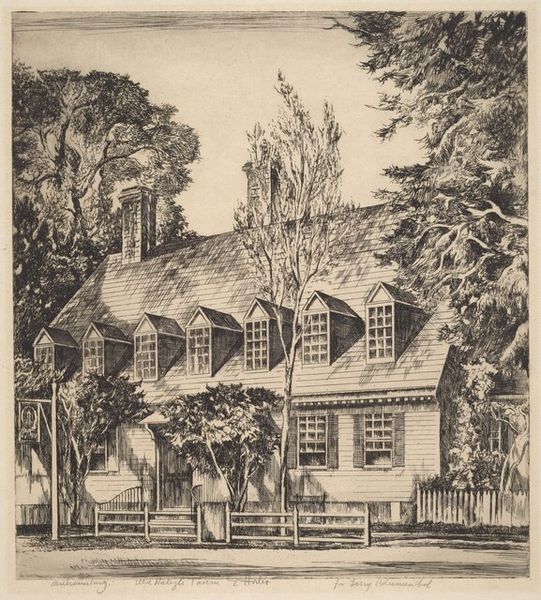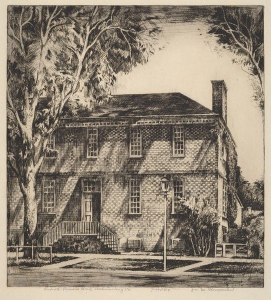 Curator: This is Kenneth John Conant’s drawing of the Cooper-Austin House in Cambridge, Massachusetts. Editor: It feels so… still. The intricate details create a sense of quiet permanence, a frozen moment. Curator: The house itself, with its colonial architecture, speaks volumes about New England history and the values of early American settlers: simplicity, resilience, and a connection to the land. Editor: The artist’s meticulous rendering, the interplay of light and shadow, creates a sense of depth. Notice how the verticals of the trees contrast with the horizontals of the clapboard. Curator: Indeed, and the placement of the tree evokes a sense of guarding and timelessness. This dwelling holds a legacy, doesn't it? Editor: Absolutely. It's more than just a picture; it's a careful arrangement of lines reflecting enduring symbols. Curator: Yes, a structure of history and memory, carefully rendered.