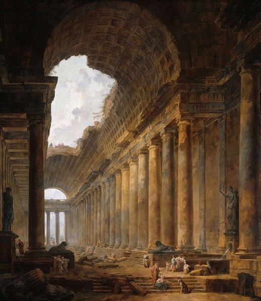 Hubert Robert painted "The Fountains" in France, a scene of classical architecture with figures rendered in oil paint. Robert lived through a transformative period in French history; from the height of the aristocracy to the throes of the Revolution. His work often captures the emotional weight of history and the presence of the past. Here, the classical forms of the ruins and the everyday people co-exist. But, the painting does not shy away from revealing class distinctions. In the foreground, the working-class interacts with the fountain while the upper class observe from above. The scale of the architecture is striking. Its grandeur evokes the concept of an enduring legacy through structural presence. However, the partial ruin suggests both time’s passage and also its selective nature. What crumbles and what endures is a testament to a society’s values. The painting resonates as an exploration of how public spaces are shaped by time and the stories they tell about us.