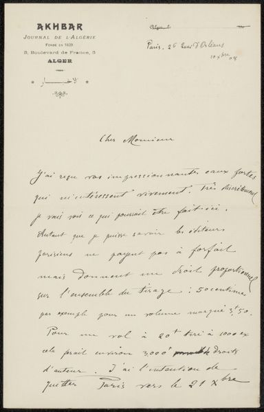 Curator: Here we have "Brief aan Philip Zilcken," or "Letter to Philip Zilcken," which we believe dates between 1901 and 1931. The letter employs ink on paper and was penned by Octave Maus. What's your immediate response to its visual presentation? Editor: The handwritten text immediately conveys intimacy and urgency. It is hard to read and almost has the appearance of frantic scribbling; as if someone wanted to relate important information with haste. Curator: The composition strikes me as meticulously balanced, despite its informal nature. Observe how the flourishes of the handwriting interact with the rectilinear form of the page. The negative space around the text functions as a kind of frame, focusing our attention. The very top of the page is delicately ornamented. Editor: Yes, the scripted "Bruxelles, 27 rue du Berger" in a delicate, rust-colored ink establishes place and adds to the feeling of importance that I alluded to. Handwriting itself bears cultural significance—each flourish and slant tells a story. I would posit that this letter contains potentially scandalous or subversive material, given that names have been censored to "Baronne D" for instance. Curator: I concur, the redacted names certainly suggest discretion, but what about the graphic weight of the ink itself? I note how the density of the ink varies, creating a subtle rhythm across the page. The artist, Maus, intentionally made adjustments within the uniformity of the writing by either dwelling on some forms, or hurrying through others. Editor: Beyond rhythm, there's a human element. The smudges and slight imperfections humanize the author. This letter is not merely a piece of correspondence; it’s a container for anxieties, secrets, and perhaps even suppressed desires. It seems charged with symbolism and emotion that transcends its textual content. Curator: Indeed, and understanding its formal qualities brings us closer to grasping its profound emotional and cultural impact. Editor: Precisely, together we've exposed layers of personal narrative held within the physical letter and its composition, which enhances the object's symbolic depth.