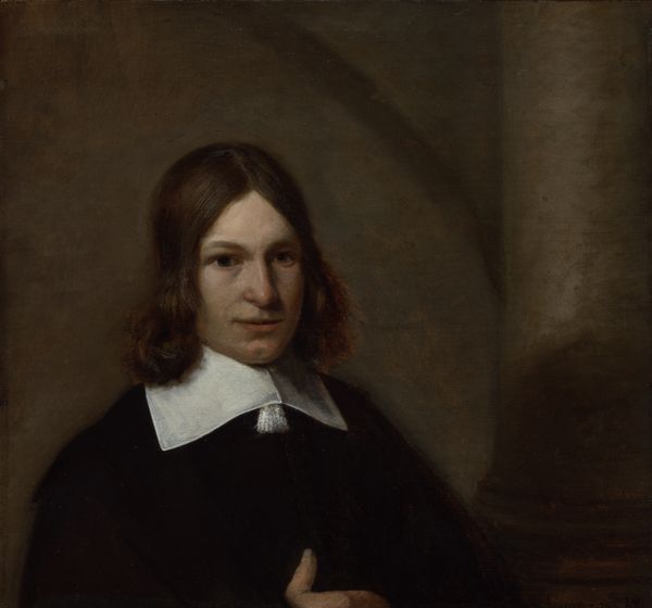 Curator: Here we have a portrait, potentially of Dirck, Johannes, or Jacobus Wallis, created in 1653 by Johannes Verspronck. It's currently housed right here at the Rijksmuseum. Editor: It strikes me as quite somber. The restricted palette and tight composition definitely contribute to this contemplative mood. Curator: The painting emerges from a very particular socio-political moment. Haarlem in the mid-17th century was grappling with the aftermath of the Eighty Years' War, burgeoning capitalism, and the powerful influence of the Dutch Reformed Church. I read that the sitter in the picture likely belonged to the city's wealthy merchant class. Editor: True, that sombre austerity might just speak to that. The texture in the gentleman's dark cloak and hat, as well as in the delicate white ruff, are expertly rendered with a surprising degree of subtlety given the muted color scheme. What’s your view of the work’s more general place in portraiture tradition? Curator: The piece clearly adheres to a standard format for depicting male members of the Dutch elite, but I read in this sitter's gaze a certain self-awareness—an understanding of the historical forces at play. The faint blush in his cheeks adds humanity. This era was defined by increasing economic specialization along lines of gender and race. So, how might his power rely on others being excluded? Editor: Interesting! I concede there may be many readings in it, though personally I feel the emphasis falls most clearly on line, texture and carefully constructed shadow—purely pictorial devices that allow the work to breathe and come to life. Curator: Ultimately, the portrait offers us a glimpse into a specific moment, rife with tensions and contradictions related to class, labor, and gender— Editor: --A glimpse constructed by subtle mastery of formal conventions. An impressive feat by Verspronck indeed.